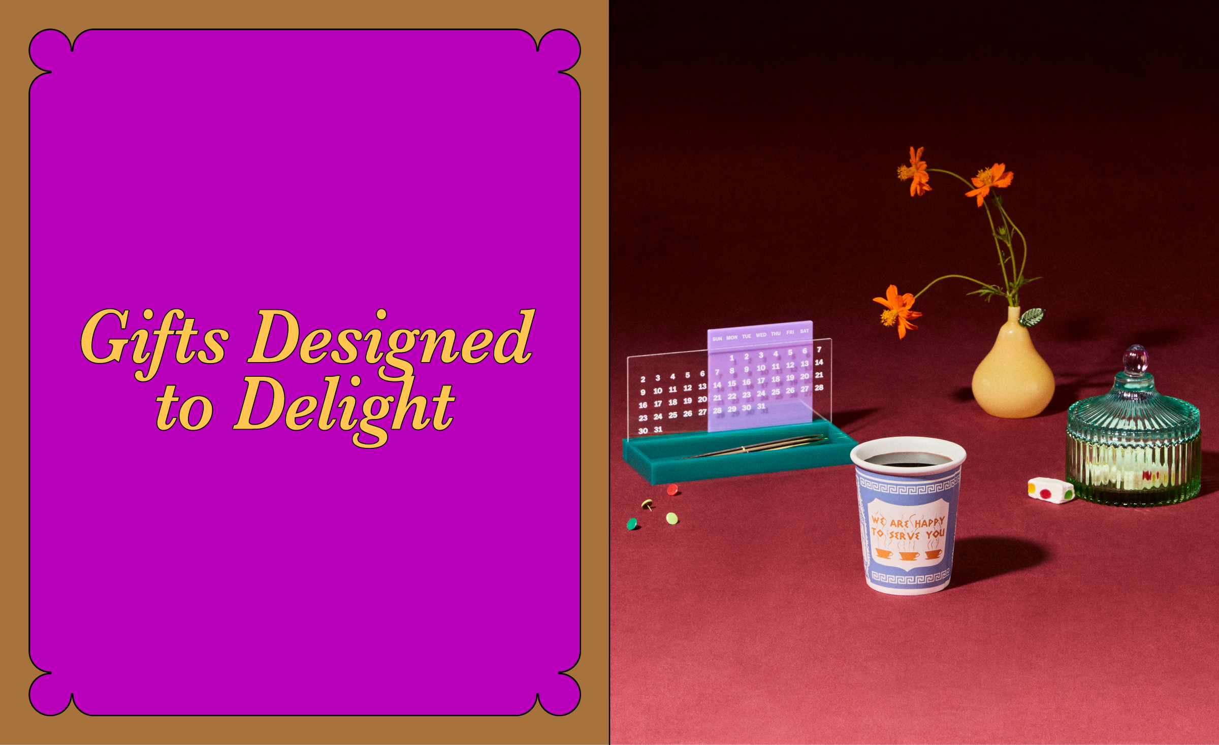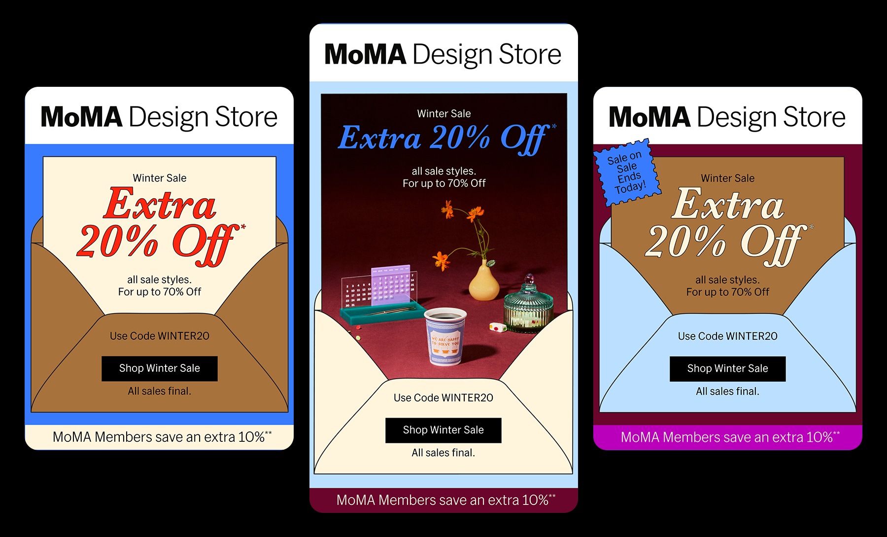 Inspired by classic holiday details such as gift wrapping, striped table linens, and vintage serving trays, the visual identity balances a refined serif italic typeface with unexpected color and clean compositions — reimagined through a modern MoMA lens.