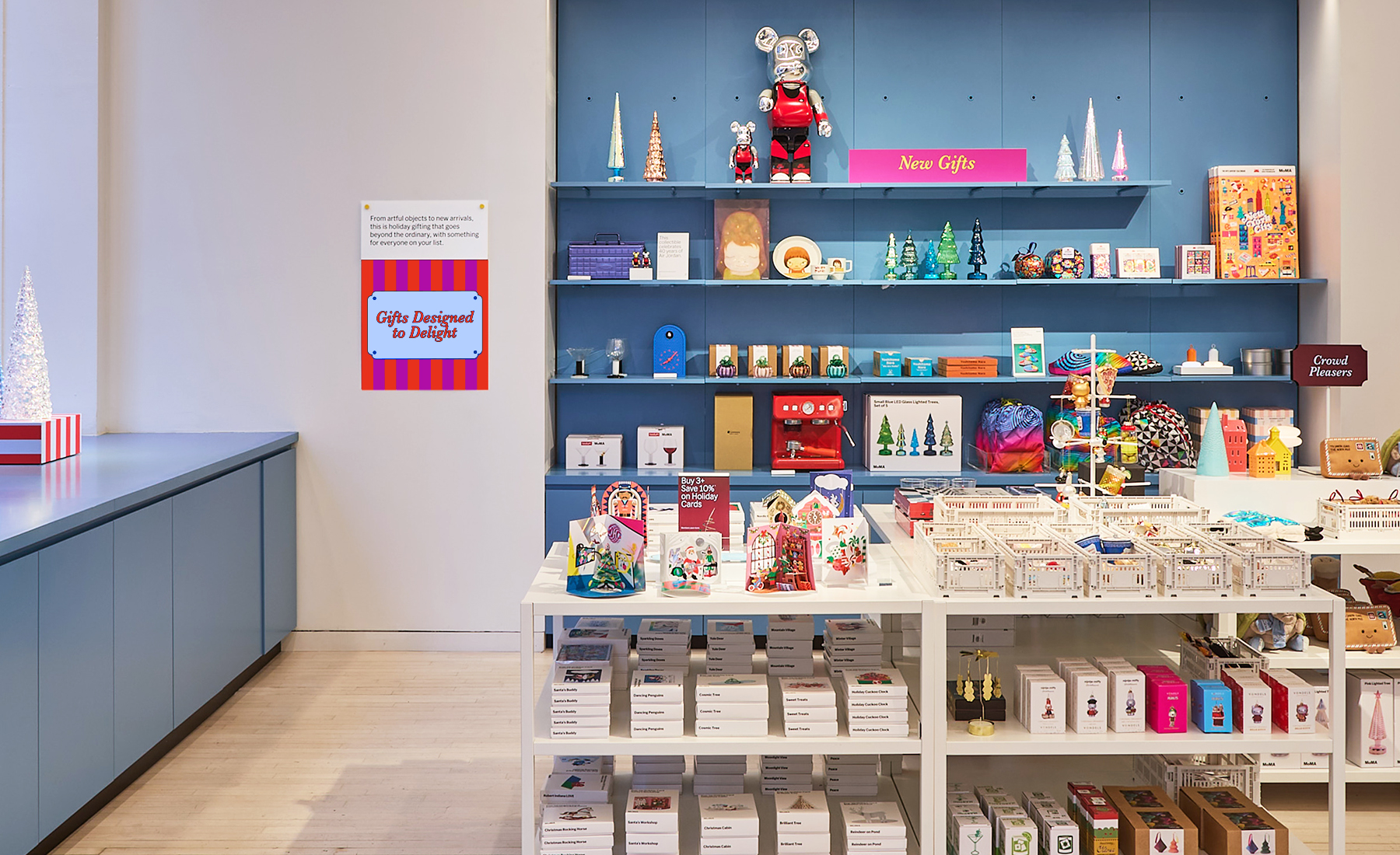 ギフトラッピングやストライプのテーブルリネン、ヴィンテージのサービングトレイといったクラシックなホリデーのディテールから着想を得たビジュアルアイデンティティは、洗練されたセリフ体イタリックと意外性のある配色、クリーンな構成によって、MoMAらしいモダンな視点で再解釈しました。
